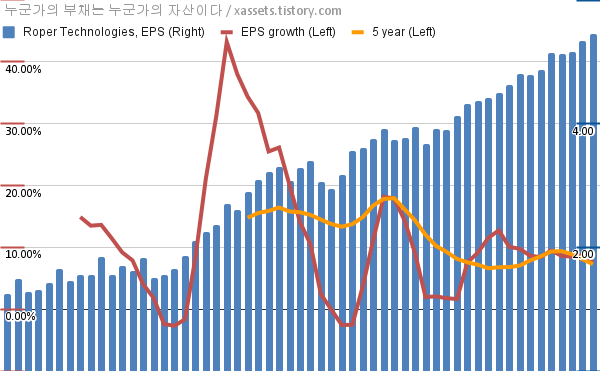 - 포스팅일 기준, 로퍼 테크놀로지스의 1, 5년 연평균 EPS 성장률은 7.55%, 7.29%이다.
