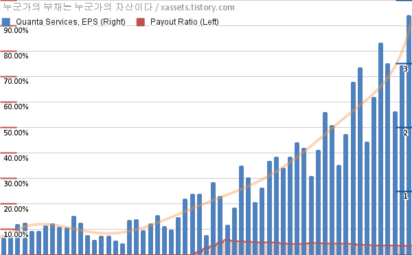 콴타 서비스 EPS 성장률, 배당성향 차트 (2012년~2026년)