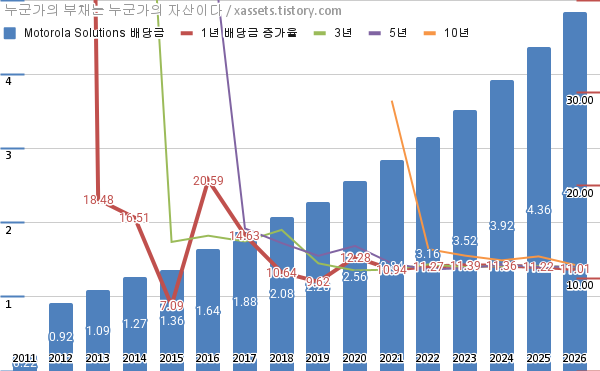 - 모토로라 솔루션스의 연평균 배당성장률은 1년 11.01%, 3년 11.20%, 5년 11.25%, 10년 11.43%이다. (2026년 기준)