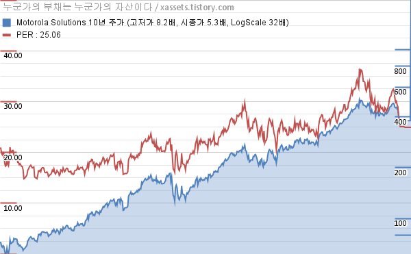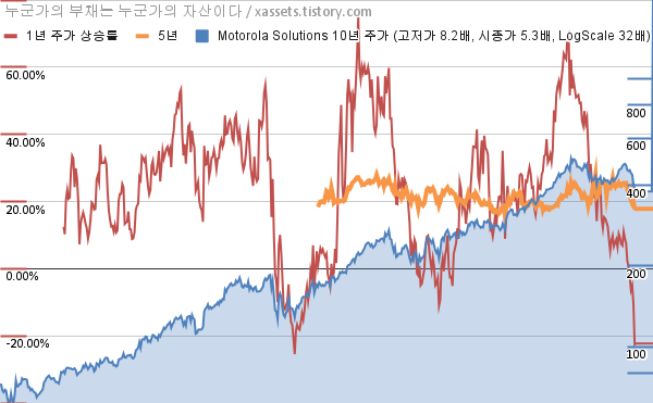 - 포스팅일 기준, 모토로라 솔루션스의 1, 3, 5, 10년 연평균 주가상승률은 -22.29%, 13.06%, 17.83%, 18.09%이다.