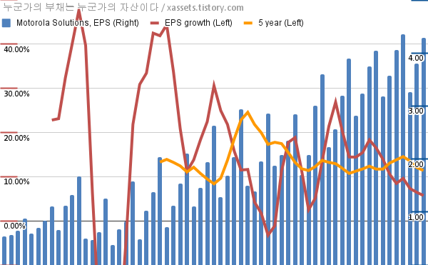 - 포스팅일 기준, 모토로라 솔루션스의 1, 5년 연평균 EPS 성장률은 5.72%, 11.40%이다.