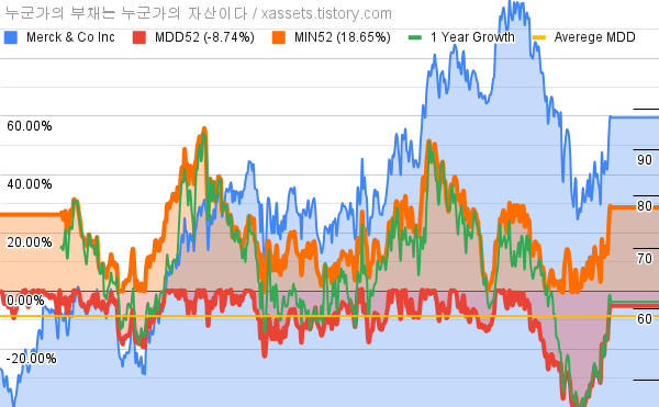 - 머크(MSD)의 10년 평균 MDD는 -8.74%고, 52주 최저가 대비 평균 상승률은 18.65%다.