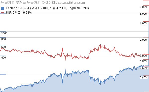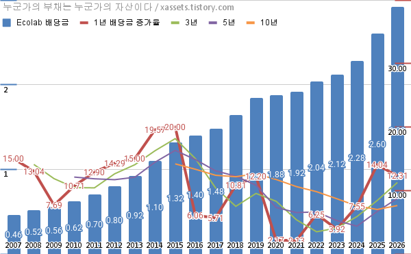 에코랩 배당금 및 배당성장률 차트 (2007년~2026년)