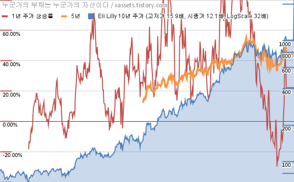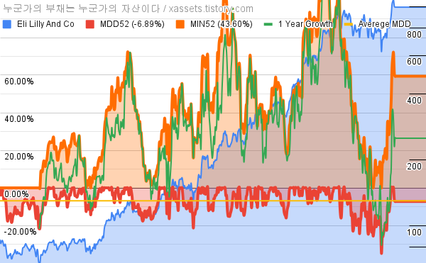 - 엘리 릴리의 10년 평균 MDD는 -6.89%고, 52주 최저가 대비 평균 상승률은 43.60%다.