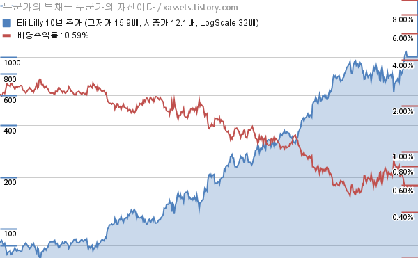 - 포스팅일 기준, 엘리 릴리의 1, 3, 5, 10년 연평균 주가상승률은 22.21%, 40.92%, 44.56%, 28.12%이다.