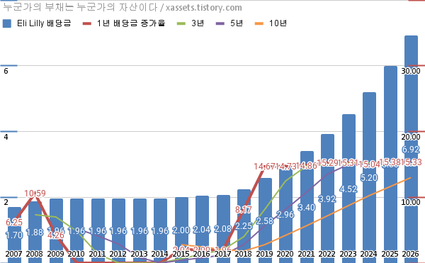 엘리 릴리 배당금 및 배당성장률 차트 (2007년~2026년)