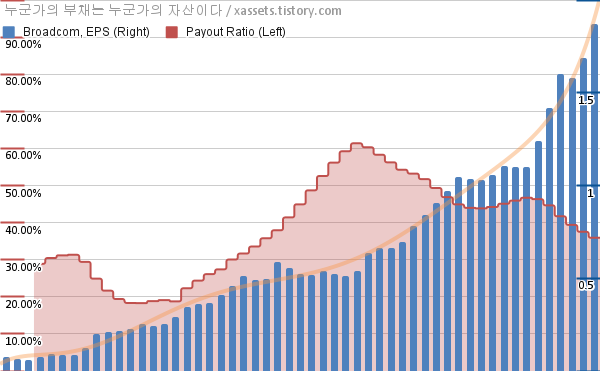 브로드컴 EPS 성장률, 배당성향 차트 (2012년~2025년)