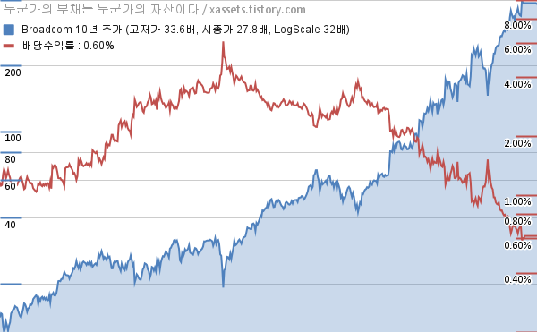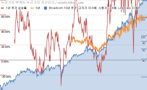 - 포스팅일 기준, 브로드컴의 1, 3, 5, 10년 연평균 주가상승률은 117.37%, 92.78%, 57.25%, 39.46%이다.