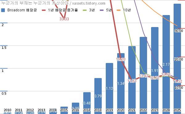 - 브로드컴의 연평균 배당성장률은 1년 11.52%, 3년 12.71%, 5년 12.63%, 10년 30.89%이다. (2025년 기준)