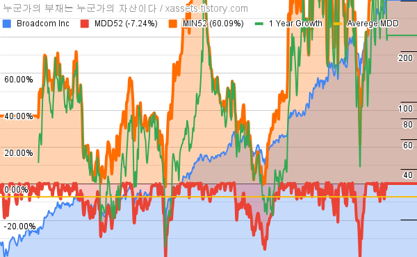 - 브로드컴의 10년 평균 MDD는 -7.24%고, 52주 최저가 대비 평균 상승률은 60.09%다.
