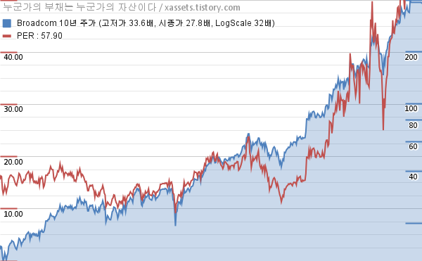 - 브로드컴의 포스팅일 기준 PER은 57.90이다.