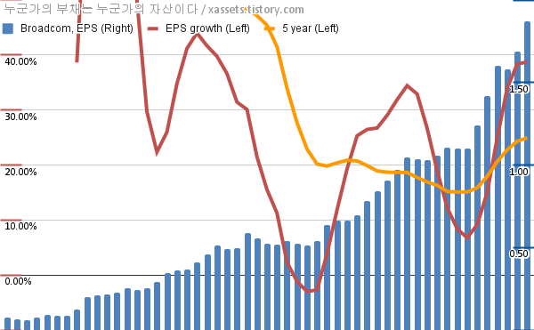 - 포스팅일 기준, 브로드컴의 1, 5년 연평균 EPS 성장률은 38.71%, 24.94%이다.