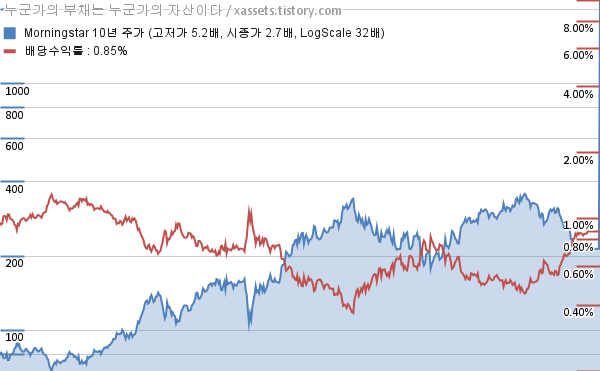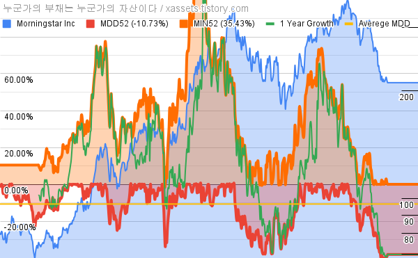 - 모닝스타의 10년 평균 MDD는 -10.73%고, 52주 최저가 대비 평균 상승률은 35.43%다.