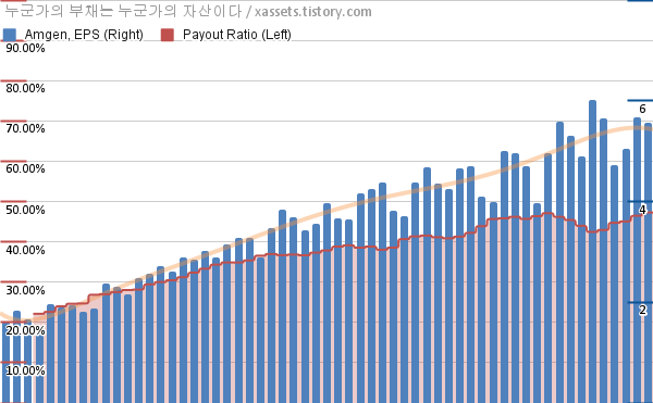 암젠 EPS 성장률, 배당성향 차트 (2012년~2026년)