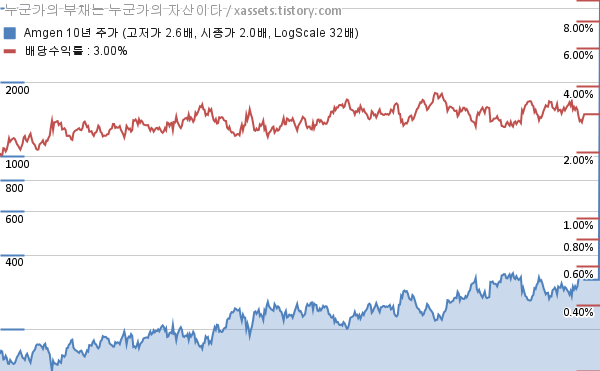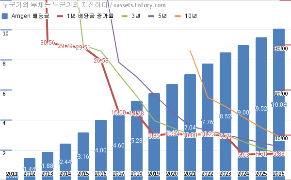 - 암젠의 연평균 배당성장률은 1년 5.88%, 3년 5.76%, 5년 7.44%, 10년 9.68%이다. (2026년 기준)