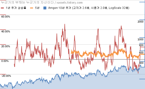 - 암젠의 10년 평균 MDD는 -8.30%고, 52주 최저가 대비 평균 상승률은 19.85%다.