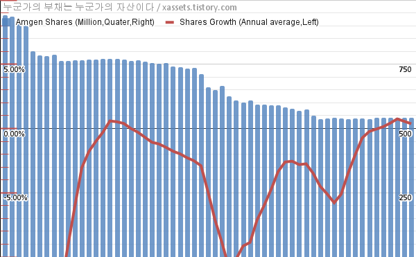 - 지난 1년 동안 암젠은 주식수가 약 0.37% 증가했다.