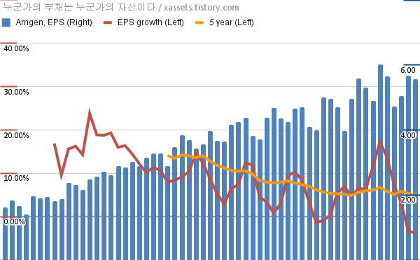 - 포스팅일 기준, 암젠의 1, 5년 연평균 EPS 성장률은 -3.84%, 4.90%이다.