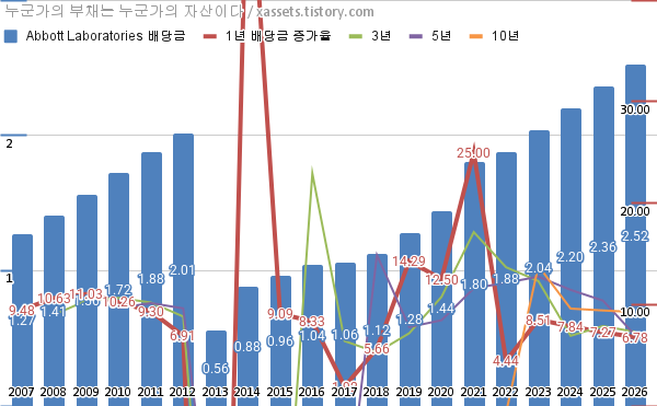 애벗 래버러토리 배당금 및 배당성장률 차트 (2007년~2026년)