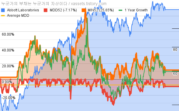 - 애벗 래버러토리의 10년 평균 MDD는 -7.17%고, 52주 최저가 대비 평균 상승률은 25.65%다.
