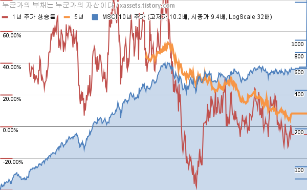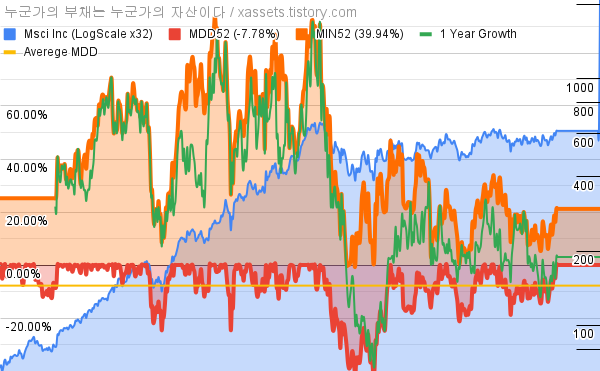 - MSCI의 10년 평균 MDD는 -7.78%고, 52주 최저가 대비 평균 상승률은 39.94%다.
