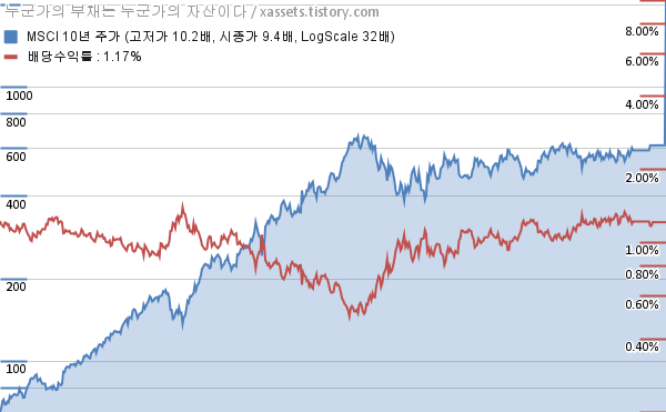 MSCI 배당수익률 및 주가 상승률 차트 (2016년~2026년)