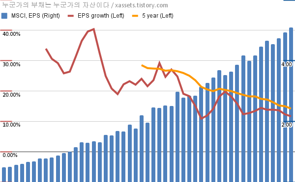 - 포스팅일 기준, MSCI의 1, 5년 연평균 EPS 성장률은 11.68%, 14.19%이다.