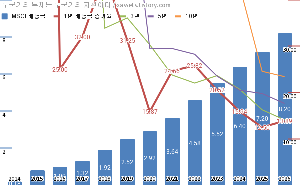 MSCI 배당금 및 배당성장률 차트 (2014년~2026년)