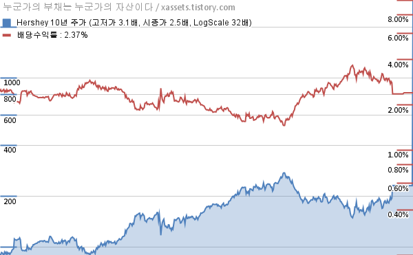 - 포스팅일 기준, 허쉬의 1, 3, 5, 10년 연평균 주가상승률은 49.44%, -1.07%, 8.87%, 9.78%이다.