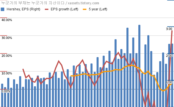 - 포스팅일 기준, 허쉬의 1, 5년 연평균 EPS 성장률은 32.96%, 3.16%이다.