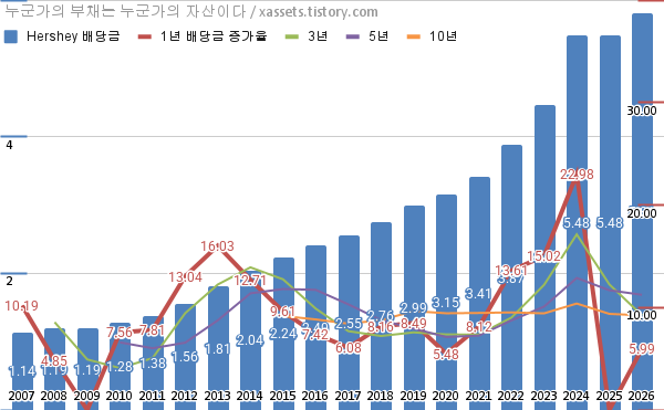 허쉬 배당금 및 배당성장률 차트 (2007년~2026년)