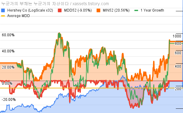 - 허쉬의 10년 평균 MDD는 -9.05%고, 52주 최저가 대비 평균 상승률은 20.56%다.