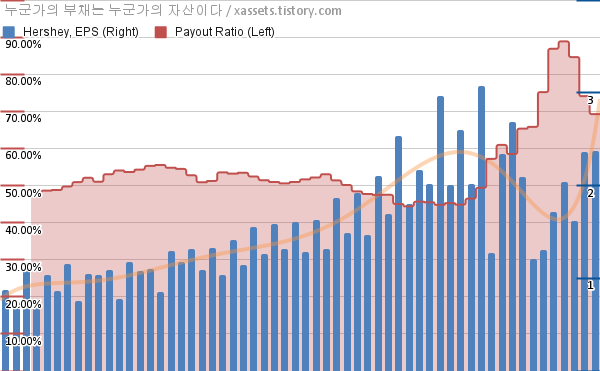 허쉬 EPS 성장률, 배당성향 차트 (2012년~2026년)