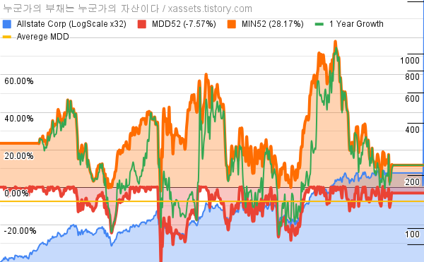 - 올스테이트의 10년 평균 MDD는 -7.57%고, 52주 최저가 대비 평균 상승률은 28.17%다.