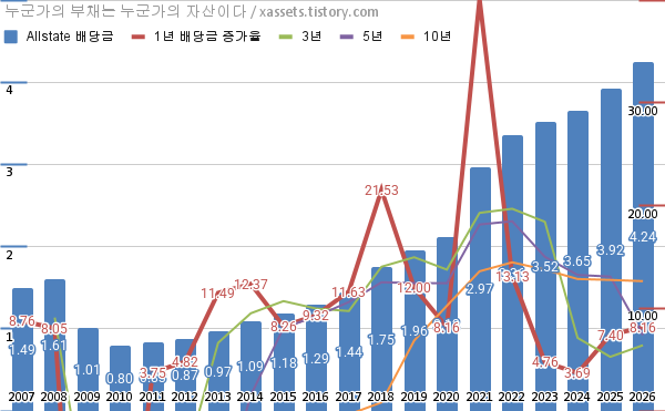 올스테이트 배당금 및 배당성장률 차트 (2007년~2026년)