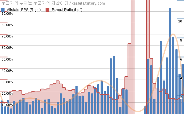 올스테이트 EPS 성장률, 배당성향 차트 (2012년~2026년)