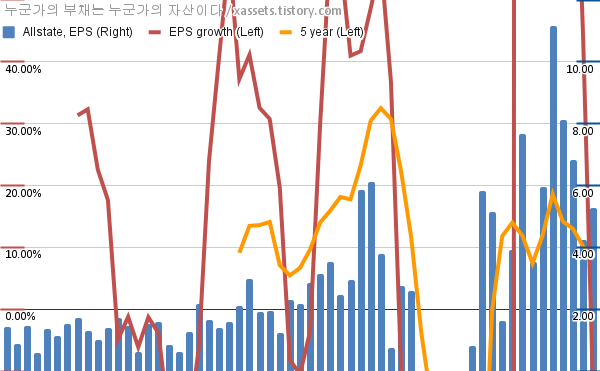 - 포스팅일 기준, 올스테이트의 1, 5년 연평균 EPS 성장률은 -28.15%, 13.42%이다.