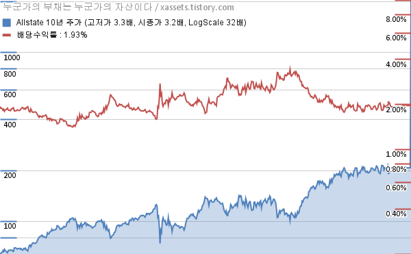 올스테이트 배당수익률 및 주가 상승률 차트 (2016년~2026년)