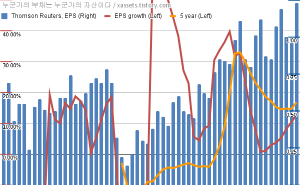 - 포스팅일 기준, 톰슨 로이터의 1, 5년 연평균 EPS 성장률은 12.79%, 16.79%이다.
