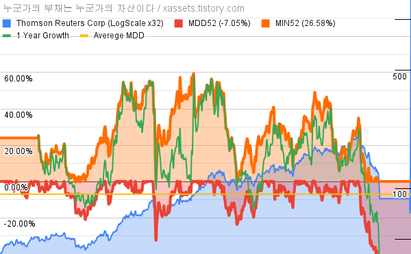 - 톰슨 로이터의 10년 평균 MDD는 -7.05%고, 52주 최저가 대비 평균 상승률은 26.58%다.