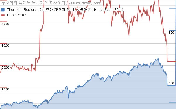 - 포스팅일 기준, 톰슨 로이터의 1, 3, 5, 10년 연평균 주가상승률은 -49.97%, -12.07%, 0.45%, 7.60%이다.