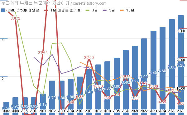 시카고 거래소 그룹 배당금 및 배당성장률 차트 (2007년~2026년)
