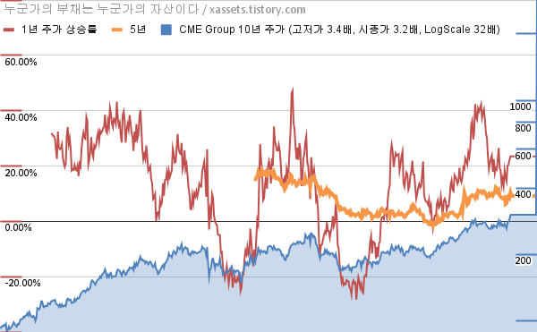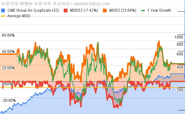 - 시카고 거래소 그룹의 10년 평균 MDD는 -7.42%고, 52주 최저가 대비 평균 상승률은 23.08%다.