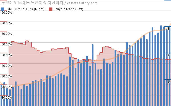시카고 거래소 그룹 EPS 성장률, 배당성향 차트 (2012년~2026년)