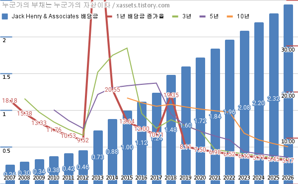 잭 헨리 앤 어소시에이츠 배당금 및 배당성장률 차트 (2007년~2026년)