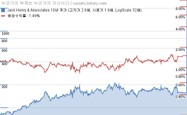 잭 헨리 앤 어소시에이츠 배당수익률 및 주가 상승률 차트 (2016년~2026년)