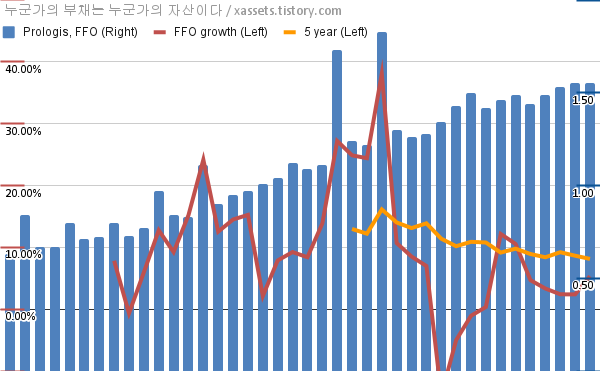 - 포스팅일 기준, 프롤로지스의 1, 5년 연평균 FFO 성장률은 5.34%, 8.13%이다.