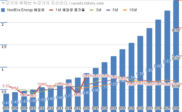 넥스테라 에너지 배당금 및 배당성장률 차트 (2007년~2026년)