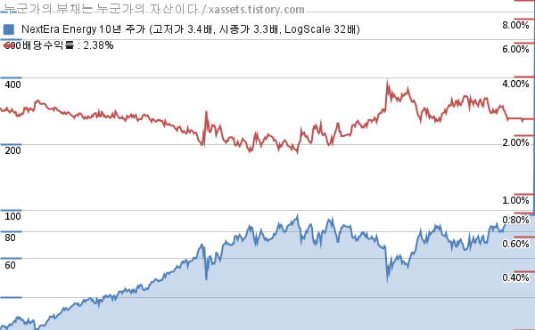 넥스테라 에너지 배당수익률 및 주가 상승률 차트 (2016년~2026년)
