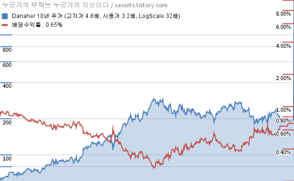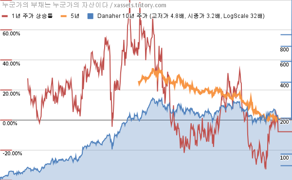 - 포스팅일 기준, 다나허의 1, 3, 5, 10년 연평균 주가상승률은 -7.81%, -2.75%, 0.54%, 11.81%이다.